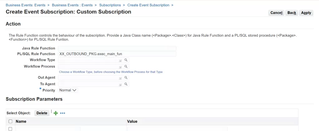 - Create a custom PL/SQL subscriber: This code will write the necessary details to a staging table (XX_CUST_OUT_STG) and queue the record for further processing.